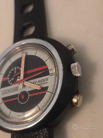 leonidas easy raider orologio cronografo degli anni 70, cassa in resina colore nero, cinturino tropic sport, l' orologio è funzionante , non necessita di nulla, carica manuale, misura cassa circa 43 millimetri, condizioni come da, l orologio è mancante della ghiera, per questo il prezzo è basso