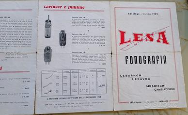 LESA FONOGRAFIA, catalogo - listino 1959 - Lesaphon, Lesavox, giradischi cambiadischi. In buono stato come da foto, le pieghe delle pagine iniziano ad aprirsi, vedi sempre foto.