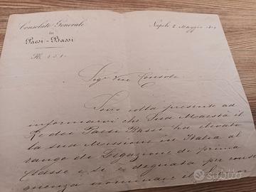 Questa è un'affascinante lettera ufficiale delConsolato Generale dei Paesi Bassi, datataNapoli, 2 maggio 1877. Il documento è scritto in una raffinata grafia corsiva dell'epoca e indirizzato a un "Sig[no]r Vice Console". Ecco una trascrizione del contenuto visibile: Trascrizione del testo Consolato Generale dei Paesi - Bassi Napoli, 2 maggio 1877 N. 151 Sig.r Vice Console Sono colla presente ad informarvi che Sua Maestà il Re dei Paesi Bassi ha elevato la sua Missione in Italia al rango di Legazione di primo... Analisi del contenuto Il documento comunica un importante cambiamento diplomatico: l'elevazione del rango della rappresentanza olandese in Italia. Contesto Storico:Nel 1877, l'Italia era un regno relativamente giovane (unificato nel 1861). Il passaggio da "Missione" a"Legazione di primo rango"indica un rafforzamento dei legami diplomatici tra il Regno d'Italia e il Regno dei Paesi Bassi (all'epoca sotto il re Guglielmo III). Sede:Napoli, pur non essendo più la capitale dopo l'Unità, rimaneva un centro diplomatico e commerciale fondamentale, motivo per cui ospitava un Consolato Generale così attivo. la lettera è affrancata con 20 cent emissione 1067 annullato effige vittorio emanuele II LA LETTERA È DIVISA A METÀ MANCANTE LA SECONDA PARTE