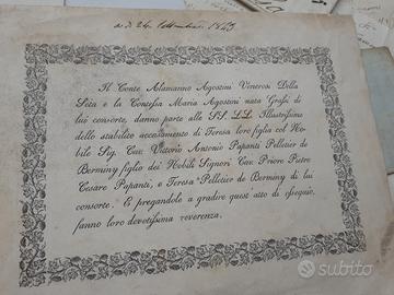 5 lettere tra nobili del 1797 , 2 inviti partecipazioni a nozze sempre tra nobili del 1843 e del 1846 , 15 ricevute pagamenti del 1740.
