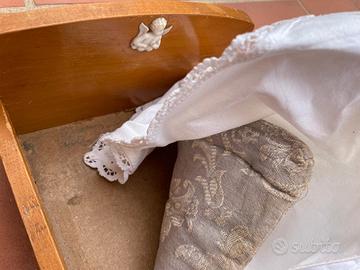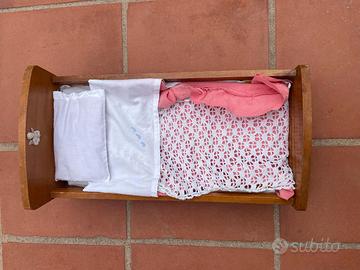 Vendo questo lettino per bambole in perfetto stato e antico. È composto dal letto vero e proprio in legno, materasso imbottito con lenzuola, copertina di lana e copriletto in merletto. Anche il cuscino è imbottito e chiuso con bottoni.