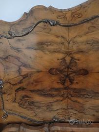 Bel letto matrimoniale, inizi '900, testata e pediera mossi finiti in radica ferrarese di una splendida tonalità dorata. Tutto in ottimo stato di conservazione considerando l'anno di produzione. Misure altezza testiera 145cm. Larghezza 170/180cm. Lunghezza 200cm circa. Solo ritiro in loco.