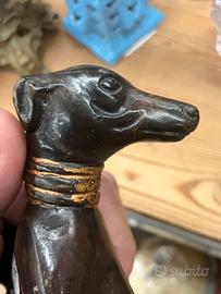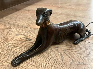 In vendita una splendida scultura d'epoca raffigurante un Levriero (Whippet) in posizione distesa, un classico intramontabile dello stile Art Déco. L'opera si distingue per le linee sinuose e minimaliste che catturano perfettamente l'eleganza e la grazia tipiche di questa razza