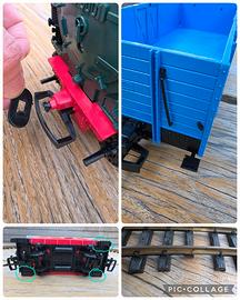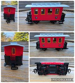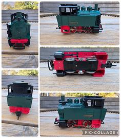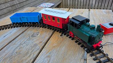 Vendo set completo LGB/Lehmann vintage composto da locomotiva, 2 vagoni, 12 binari curvi, trasformatore e cavi. Uno dei primi set del marchio degli anni 70' (cod. art. "Primus 8000"). Buono stato con qualche segno di usura e piccoli pezzi danneggiati (vedasi ultima foto). Il tetto del vagone passeggero è stato verniciato in bianco. Perfettamente funzionante.