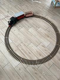 Locomotiva 2 vagoni e 12 pezzi di rotaie che formano un cerchio con proprio controller e trasformatore perfettamente funzionante