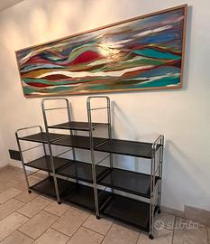 Questo sistema di scaffalature modulare da sogno è progettato nel tipico design post moderno ed è originale degli anni '70 Le barre sono in metallo cromato, i ripiani sono in lamiera forata verniciata nera. in ottime condizioni . Mis due pali 133 cm due pali 95 cm 10 mensole 60x 37 cm