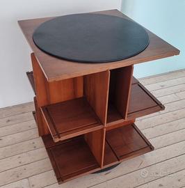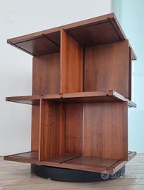 Libreria girevole 823 di Giancarlo Frattini per Bernini. Anni 60', tutta in noce con piano circolare rivestito in pelle nera. Tutte le pareti laterali sono movibili e si possono posizionare a proprio piacimento grazie ai binari.