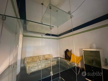 Sono due file, formate da 4 ripiani da 60 x 60 cm ed un ripiano più grande da 60 x 112 cm, la composizione si può modificare a piacimento. I piani sono in vetro temprato, i tiranti sono in acciaio. Le due plafoniere in pieno stile Space Age sono in materiale plastico bianco, ABS.