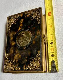 Libretto di preghiere antico anno 1857 con inserti lavorati a mano in metallo con sfondo maculato.
