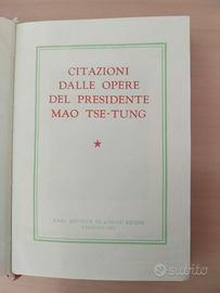 Ritratto fotografico a colori di Mao protetto da velina e facsimile dell‘iscrizione autografa del compagno Lin Piao "Studiare le opere del presidente Mao, seguire i suoi insegnamenti e agire secondo le sue istruzioni". Sopracoperta editoriale rossa in materiale polimerico, segnalibro in stoffa, titoli e stella impressi a secco al piatto anteriore, pagine 332. Condizioni ottime.