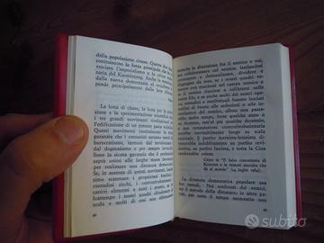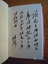 Citazioni dalle opere del Presidente Mao Tse-Tung. Pechino, Casa editrice in lingue estere, 1969. In - 32 (mm 75 × 110). Ritratto fotografico a colori di Mao protetto da velina e facsimile dell‘iscrizione autografa del compagno Lin Piao "Studiare le opere del presidente Mao, seguire i suoi insegnamenti e agire secondo le sue istruzioni". Sopracoperta editoriale rossa in materiale polimerico, segnalibro in stoffa, titoli e stella impressi in oro al piatto anteriore, pagine 332. Condizioni eccellenti pari al nuovo. Rara prima edizione della traduzione italiana in formato tascabile. Preferibile il ritiro a mano. Visibile senza impegno zona centro storico Brescia. A richiesta si spedisce con poste italiane busta imbottita raccomandata tracciata 6 euro in più. Se l'annuncio è attivo il prodotto è disponibile. Modalità di pagamento da concordare preventivamente.