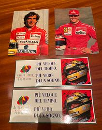 Libri su Valentino Rossi e sulla F1. Cartoline di Ayrton Senna e Schumacher. Adesivi di Senna.