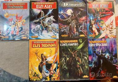 Sette Libri/manuali fantasy "Gli Eserciti di Warhammer" degli anni 90 dai seguenti titoli: Bretonnia (1996); Elfi Alti (1997); Elfi Silvani (1998); Elfi Scuri (1998); Vampiri (1999); Conti Vampiro (2001); Elfi Oscuri (2001).- Ogni volume contiene le storie con bellissime illustrazioni della razza, descrizione dei personaggi e unità, foto per colorazione e composizione dell'esercito e regole dettagliate per giocare a warhammer.- Il prezzo è inteso per un volume singolo, per due o tre insieme sconto 5 euro a volume, per tutti e 7 i volumi il prezzo è di 140.- Libri rari e quasi introvabili.-