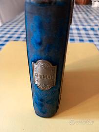 Copertina riccamente decorata con elementi metallici ed al centro una placca a forma di scudo in ottone. Aspetto vintage di pregio ed un età considerevole, Pagine dorate e chiusura con bella fibbia in metallo. Dimensioni 7 x 11 x 2.