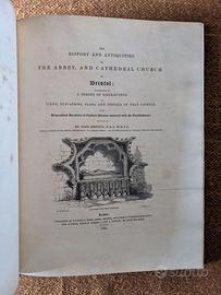 “The history and antiquities of the abbey and cathedral church of Bristol illustrated by a series of engravings of views, elevations, plans and details of that edifice, with biographical anecdotes of eminent persons connected with the establishment, by John Britton”, London 1830; dimensioni: 22x28,5x2cm; completo di tutte le tavole, con ex libris; copertina staccata, per il resto buone condizioni