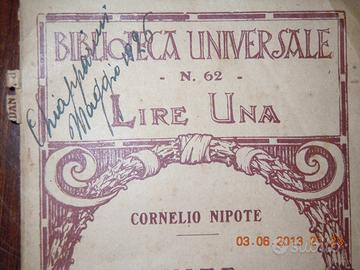 Vendo libro antico della collana Biblioteca Universale n. 62, di CORNELIO NIPOTE, titolo: VITE DEGLI ECCELLENTI COMANDANTI, composto da n. 104 pagine. Contiene la seguente dedica sulla copertina: Chiapparini - maggio 1926, come da foto.