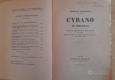 Libro d'epoca in francese originale della celebre opera teatrale "Cyrano de Bergerac" di Edmond Rostand, pubblicato a Parigi da Fasquelle Editeurs anni 1948/50 circa. L'edizione riporta l'indicazione "Neuf cent quatrieme mille" (904.000° copia), a testimonianza del successo editoriale dell'epoca, un pezzo di storia del teatro francese, stampato Imprimerie Regionale Tolosa. Condizioni originali "vissuto ", la copertina presenta segni del tempo, piccole mancanze sui bordi e due piccoli scarabocchi, interno completo, presenta una dedica e una firma manoscritta datate 1950.