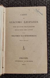 Vendo raro e antico libro Tascabile, misura cm 8 X 12 con spessore di cm 2, il libro è una terza edizione dei Canti di Giacomo Leopardi pubblicato nel 1887 a Firenze dalla casa editrice Successori Le Monnier, le condizioni sono discrete, sono presenti tutte le pagine e la copertina.