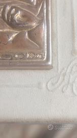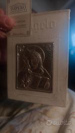 formato 10x14 cm impreziosito da icona centrale in argento lavorazione artigianale della impero argenti, integro rilegatura salda copertina in pelle bianca rigida con piccoli segni del tempo