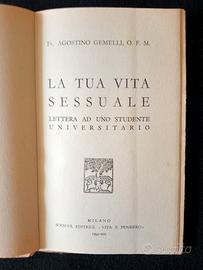 Bellissimo piccolo libro in ottime condizioni. Autore: Padre Agostino Gemelli, frate francescano, medico e psicologo, fondatore dell’Università Cattolica del Sacro Cuore. Editore: Società Editrice Vita e Pensiero. Data di pubblicazione: MCMXLI-XIX (1941) indicato anche l’anno dell’era fascista(XIX). Misure: cm.18x11,5x0,7. L’opera affronta il tema della sessualità da una prospettiva che unisce medicina, psicologia e morale cattolica. Copertina morbida. L’ immagine del David di Michelangelo in copertina viene utilizzata per rappresentare la perfezione del corpo umano e il tema della sessualità in chiave artistica e morale.