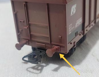 Difetti: un respingente di un carro è stato reincollato, danneggiandosi mentre veniva estratto dalla scatola. Le foto sono evidenziate con una freccia gialla.
