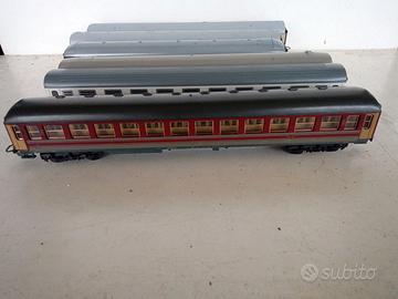 N°5 Carrozze FS della Lima in scala H0 in Ottime condizioni con carrelli ruote ganci e respingenti a posto: - Carrozza "Trans Europ Express" FS = 15 € - Carrozza "Trans Europ Express" FS = 15 € - Carrozza Self Service FS = 10 € - Carrozza FS di 2^cl. XMPR = 15 € - Carrozza FS di 2^cl. Rosso Fegato = 15 €(VENDUTA) - Bagagliaio/Poste grigio/ardesia riga bianca = 18 € Pagamento e Spedizione, 6/7 € con pacco tracciabile di Poste, gestiti direttamente. Anche contatti whatsapp al 3385923596.