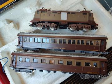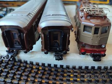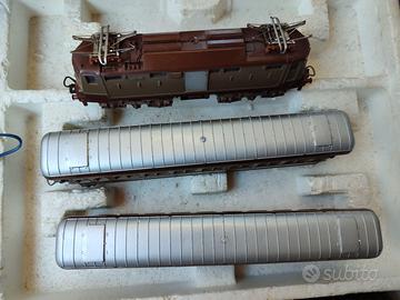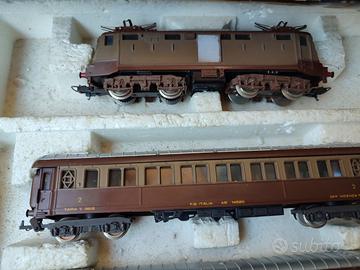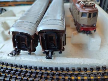 LIMA H0 CONFEZIONE DI AVVIO ANNO 64 ART. 7605, CONVOGLIO PASSEGGERI FS COMPOSTO DA: LOCOMOTIVA FS E424 103 ART 208022 MOTORE G, PANTOGRAFI INTEGRI COMPLETI DI MOLLE REALIZZATI COMPLETAMENTE IN METALLO CON POSSIBILITA' DI MODIFICA PER CAPTAZIONE DELLL'ALIMENTAZIONE DALLA LINEA AEREA; CARROZZA TIPO Az DI 1^CL. FS CASTANO E ISABELLA ART. 309101; CARROZZA TIPO Bz DI 2^CL. FS CASTANO E ISABELLA ART. 309100, RESPINGENTI TUTTI PRESENTI; 1 TRASFORMATORE; CIRCUITO A OTTO DI BINARI. RUOTE IN METALLO. IL CONVOGLIO E' PARI AL NUOVO TRANNE LA SCATOLA CON QUALCHE SEGNO DEL TEMPO