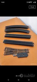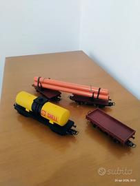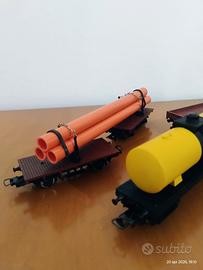 Set di modellini di treni Lima degli anni '70. - Carrozza merci con carico di tubi arancioni. - Carro cisterna Shell giallo. - Carrozza merci pianale marrone. - Binari dritti (8) Lima Ho 3020 - Binari curvi (10) Lima Ho 3030 - Deviatoio (1) Lima Ho 3060/E Lotto completo per 25€ non trattabile