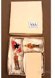 LINEOL 2 soldatini giocattolo "SA" Prodotto in Germania •Soldato in marcia con una bandiera di latta •1 soldat0 di fanteria in marcia raffigurati in Camicie Brune, Stivali da cavallerizzo e Kepis. Le SA erano colloquialmente chiamate Camicie Brune per via del colore delle camicie della loro uniforme Originale circa 7 cm con scatola non originale Produttore: LINEOL - prodotto in Germania Lineol Corporation fu fondata nel 1906 da Oskar Wilhelm Wiederholz. L'artista berlinese Albert Caasmann fu uno dei responsabili del successo di Lineol. L'elevato livello di dettaglio dei personaggi ne determinò il rapido successo. I personaggi di massa di Lineol sono facilmente distinguibili grazie alla base rettangolare