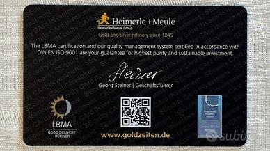 Lingotto Oro HEIMERLE & MEULE 0,5 g Puro 1/2 gr Grammo Blister 24 KT AU 9999.