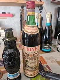 tre bottiglie vintage Di una grappa di ruche 150 tesimo anniversario della fondazione 1 mirto di Sardegna, 1 aperitivo amaro fratelli beccaro,1 birra tyrolian brau tedesca