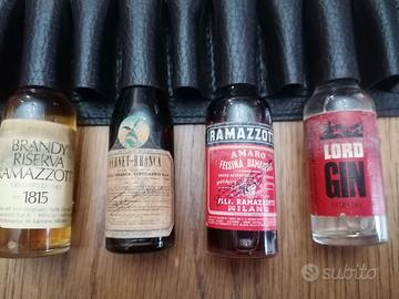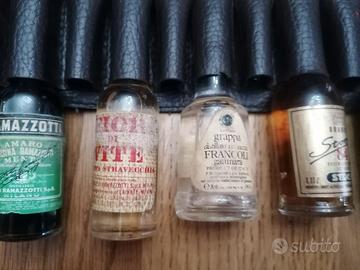 Serie di 12 bottigliette mignon di marche non più sul mercato + cartuccera in pelle cal.20 vintage