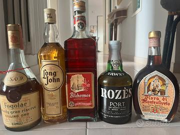 Rozes vino loquoroso di Porto. Flora di monteoloveto preparato di 22 erbe. Fogolar brandy gran riserva bollino oro puro distillato di vino. Long john scotch whisky. Alchermes liquore dolce. Prezzo 30 euro ciascuno tranne Alchermes 10 euro