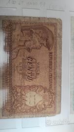 Banconote lire e Am lire: 100 lire Italia elmata pessime condizioni 500 lire del 1978 molto circolate usate 1 lira 1939 molto usurata 1 lira 1944 discreta 5Am lire due pezzi series 1943 e 1943A usurate