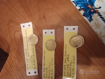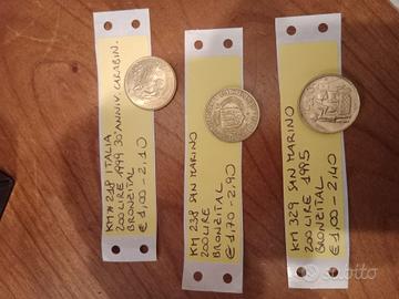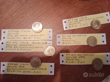 Lotto di 6 monete da 200 Lire italiane con diversi codici KM. - KM#164 Italia, 1994 180° Anniv. Carabinieri, Bronzital - KM#184 Italia, 1996 100° Anniv. Accademia Guardia di Finanza, Bronzital - KM#186 Italia, 1997 100° Anniversario Lega Navale, Bronzital - KM#218 Italia, 1999 30° Anniv. Carabinieri, Bronzital - KM#238 San Marino, Bronzital - KM#329 San Marino, 1995, Bronzital
