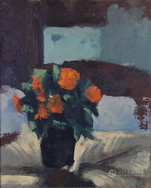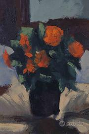ARTE CONTEMPORANEA. VASO CON MAZZO DI ROSE. DIPINTO AD OLIO SU TELA CON CORNICE ARGENTATA E PASSEPARTOUT. MISURA SOLO TELA 45X55 CM.