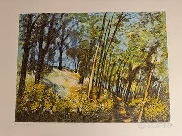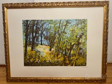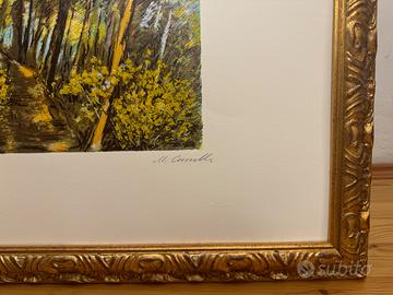Opera autentica del celebre pittore e incisore abruzzese, raffigurante un luminoso sentiero nel bosco con piccola casa immersa nel verde, resa con la tipica tavolozza vibrante e impressionistica dell’artista.