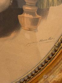 Il foglio appare integro, senza ossidazioni evidenti; la stampa ha ancora buona freschezza cromatica. Cornice ovale dorata originale d’epoca in ottimo stato.