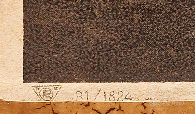 La stampa presenta in basso a sinistra il numero “31 / 1824” e un marchio tipografico triangolare con iniziali “RB”, verosimilmente riferibili alla serie editoriale di appartenenza (vedere foto dettaglio). Si tratta di una litografia della prima metà del XIX secolo: non è presente battuta di lastra, la carta è sottile e leggermente vellutata al tatto, e l’immagine risulta visibile in trasparenza in controluce, caratteristiche coerenti con la tecnica litografica dell’epoca (vedere foto in controluce).