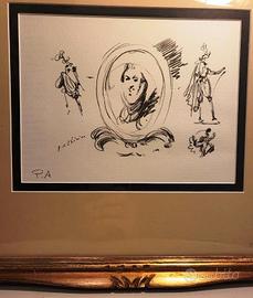 Il foglio contiene diverse figure abbozzate a inchiostro, tra cui una figura centrale in un ovale e personaggi in abiti d'epoca, temi ricorrenti nell'opera grafica di De Chirico dedicata a studi teatrali o storici.