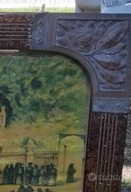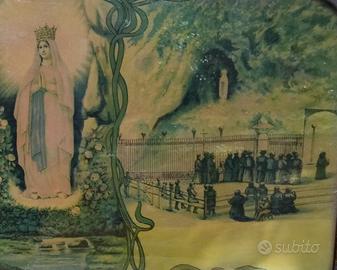 Antica litografia del Santuario della Madonna di Lourdes con cornice decò, in legno dipinto e con raffinati inserti angolari in rame con motivi floreali. Da restaurare. Misura:cm89x48.