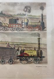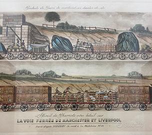 “La Voie Ferree de Manchester et Liverpool” Litografia d’autore ferrovia di H. Floury. Misure Stampa 40x70 cm montato su cornice in legno con vetro.