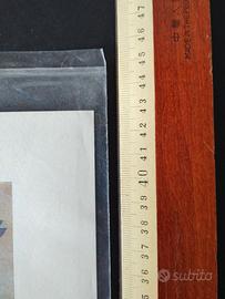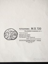 La prima immagine è una stampa prodotta dall' Istituto Fotocromo Italiano (I.F.I.) di Firenze. L'immagine raffigura l'Adorazione dei Pastori. L'originale è opera di Pellegrino di Mariano (attivo tra il 1449 e il 1492), un celebre pittore e miniatore della Scuola Senese del XV secolo e si trova presso la Libreria Piccolomini, situata all'interno del Duomo di Siena. Si tratta di una lettera miniata (una "T" decorata) all'interno di un corale, ovvero un grande libro contenente i canti per la messa. Accanto alla miniatura si nota la notazione musicale medievale su tetragramma (quattro linee rosse) con note quadrate (neumi), tipiche del canto gregoriano. Si legge "Tecum principium...", che fa parte del Salmo 110 tradizionalmente cantato durante la Messa di Natale. La seconda immagine è una stampa della Edizioni d'Arte Nova Lux - Firenze, anch'essa riferita ad un corale, ma più antico, del XIV secolo. L'illustrazione all'interno della lettera miniata rappresenta il Battesimo di Gesù. La rappresentazione è nel tipico stile gotico fiorentino del Trecento, caratterizzato da un uso abbondante dell'oro zecchino nell'originale, colori vivaci e decorazioni floreali a "viticci" che incorniciano la pagina. Si tratta di un canto gregoriano scritto su un tetragramma. Si legge chiaramente l'inizio dell'antifona: "HODIE... BAPTIZATO DOMINO...". Entrambe le stampe risalgono alla metà degli anni '70, sono in condizioni eccellenti e conservate in buste protettive.