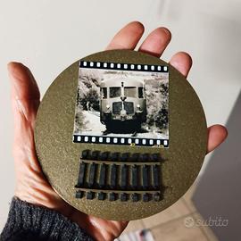 Esclusiva MAXI CALAMITA a disco, diametro 12 cm, riproducente con lo stile grafico di un fotogramma un'automotrice diesel ALn 772, una delle più diffuse "littorine" che hanno segnato la storia della rete FS non elettrificata e che hanno espletato servizio su tratte secondarie fino agli anni Ottanta. Un simbolico segmento di binario del modellismo ferroviario in scala H0 completa l'articolo, adatto ad essere attaccato al frigorifero o ad altro supporto metallico ma anche APPENDIBILE a qualsiasi parete di casa, ufficio o diverso ambiente a piacimento. L'originale calamita si presta bene come regalo a chi lavora o ha lavorato nel settore ferroviario e agli appassionati di modellismo e treni d'epoca.