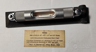 Livella professionale STARRETT ( #98) con base di riscontro . Elevatissima manifattura, sensibilissima, un vero strumento di misura per mettere a bolla apparecchiature professionali dove è richiesta una vera precisione. Fornita con scatola e specifiche tecniche. Nuovissima. ( cm. 15 x 3 )
