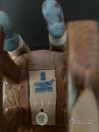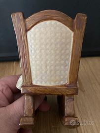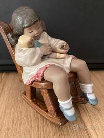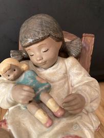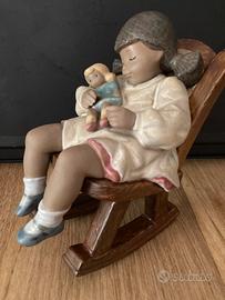 Bellissima statuina Lladró raffigurante una bambina che dorme serenamente su una sedia a dondolo con la sua bambola.