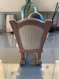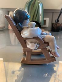 Statuetta in finitura smaltata lucida, raffigura una tenera bambina seduta su una sedia a dondolo che abbraccia la sua bambola nel suo momento di pisolino.
