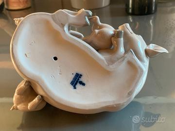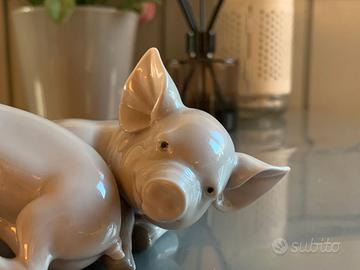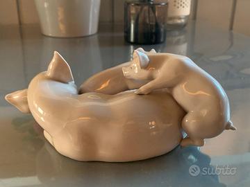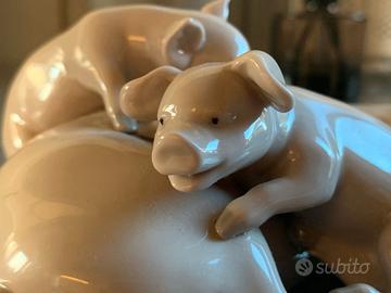 Splendida e dettagliata porcellana smaltata in finitura lucida, che rappresenta una scena di due maialini che giocano sopra la mamma scrofa, che sembra stia cercando di dormire.