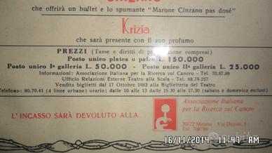 La locandina è di colore beige, misura cm 26 x 19, in alto reca il simbolo del "TEATRO ALLA SCALA" - ente autonomo - sotto ci sono le scritte "Comune di Milano Rai Radiotelevisione Italiana Teatro alla Scala Associazione Italiana per la Ricerca sul Cancro", poi ci sono le varie presentazioni con i presenti alla serata: il regista TONY PALMER, il direttore della fotografia VITTORIO STORARO e VANESSA REDGRAVE (Cosima); in fondo gli "sponsor": Buitoni, Cinzano e Krizia