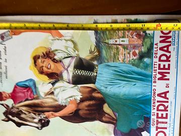 Cartoncino pubblicitario, lotteria di Merano anni 40/50 firmato Holler. Formato 35 × 24 cm destinato alle ricevitorie autorizzate. Grafica illustrata con cavallo da corsa, fantino e figura femminile in abito tradizionale tirolese. Presente dicitura del ministero delle finanze.-ispettorato lotto e lotterie. stampa d’epoca su cartoncino, con naturali segni del tempo coerenti con l’età. Oggetto da collezione di grafica pubblicitaria italiana del dopoguerra